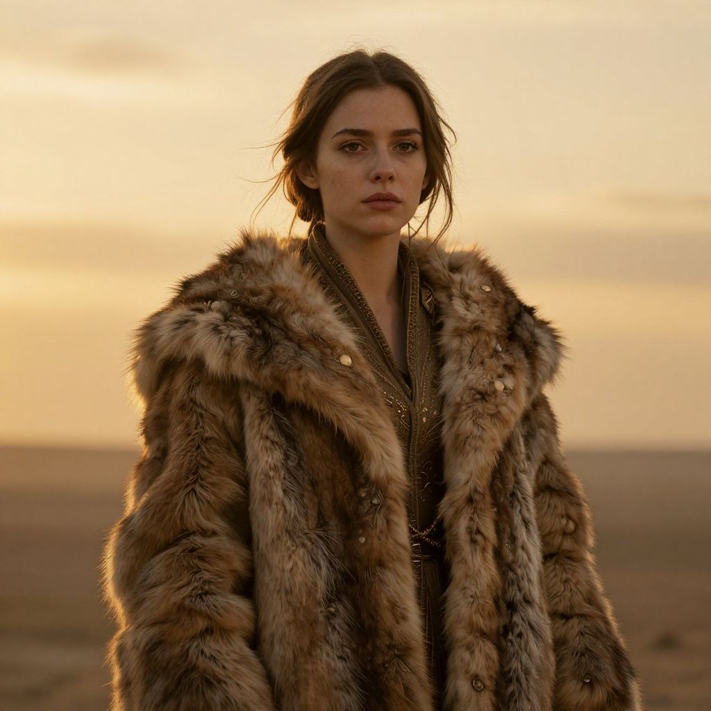 Photograph of a serious-looking woman with light brown skin and dark brown hair tied back, standing in a desert landscape at sunset. She wears a thick, brown fur coat with large, fluffy textures and multiple buttons, over a dark, metallic-patterned shirt. The golden light from the setting sun casts a warm glow, creating a contrast with the cool tones of her coat. The background is a blurred, expansive desert with a gradient of yellow and orange hues. Her makeup is subtle, enhancing her natural features, and she has a focused, determined expression.