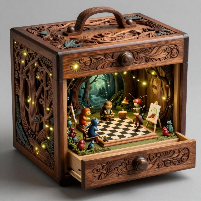 Craft an enchanting digital artwork embodying the surrealism of Jan Švankmajer, showcasing a meticulously crafted wooden puzzle box adorned with intricate carvings depicting a mysterious forest and luminous fireflies on its surface. Upon opening this perplexing artifact, discover a captivating miniature world within, teeming with whimsical creatures partaking in peculiar activities such as playing chess or painting on tiny easels. This unique perspective should be from an insect's eye view, highlighting the intricate details of both the exterior and interior realms to inspire feelings of wonder, curiosity, and enchantment in the viewer.