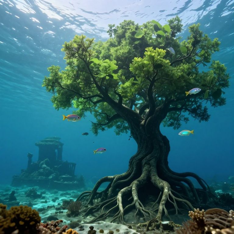 Photograph of a submerged tree with green leaves, surrounded by colorful fish, rooted in a coral reef, with an ancient ruins structure in the background underwater