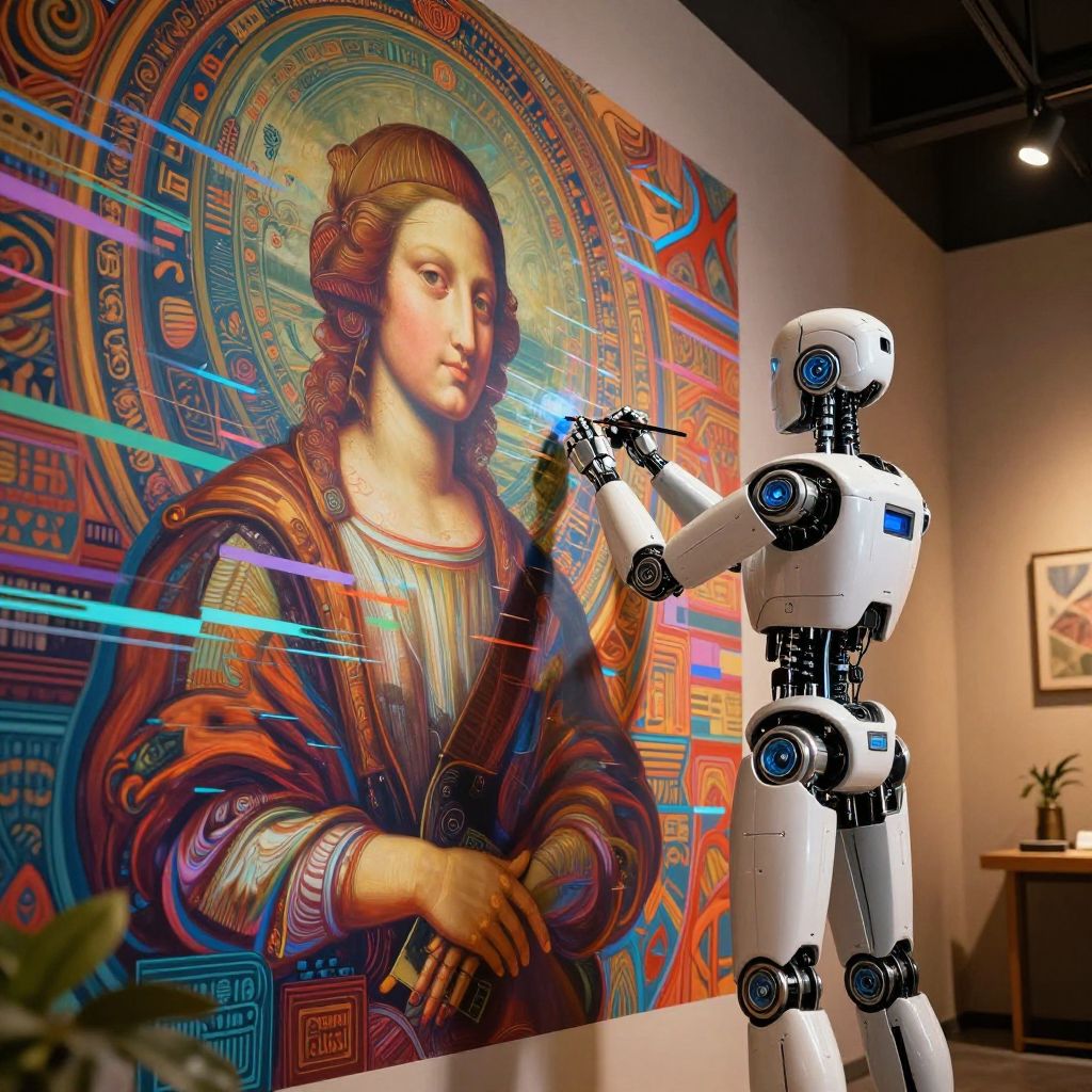 Ai art changer concept depicting a robotic artist crafting an enormous mural, blending classical art with digital glitch effects, vibrant color palette, intricate details, modern and traditional art synthesis, warm ambient lighting