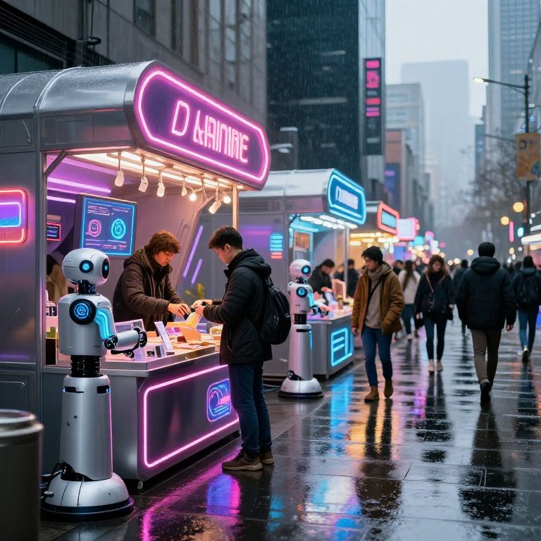 Photograph of a rainy urban street with neon-lit robotic food stalls, people in winter clothes, and reflections on wet pavement.