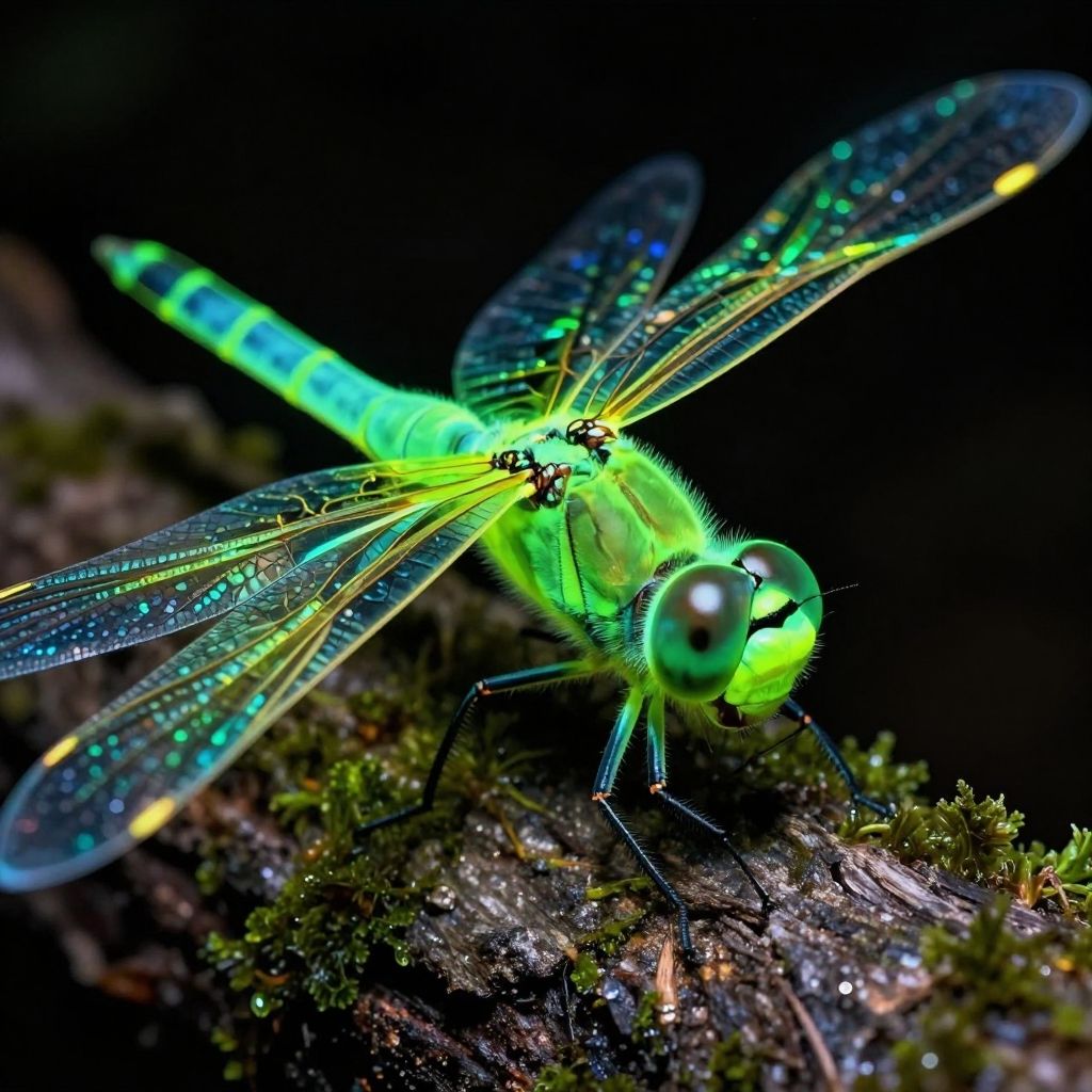(Pui), (UHD:1.2), (from above), close-up encounter with a (bioluminescent:1.28) (dragon-fly:1.2) (dragon head), its (iridescent wings shimmering:1.1) intricate details of its (compound eyes:1.18), black background, (mossy log:1.1), (neon color scheme: (black background:1.2), (darkness:1.0), (dim glow:1.2), (neon green:0.6))(hyperdetailed:1.2)subsurface scattering, (Photorealistic:1.2), Hyperrealistic, analog style, realistic, film photography, (background visible:1.2), (Style: highres photo, cinematic Lighting, trending on artstation, ((high quality:1.2, masterpiece:1.2)), (8k resolution), high details, incredibly absurdres)