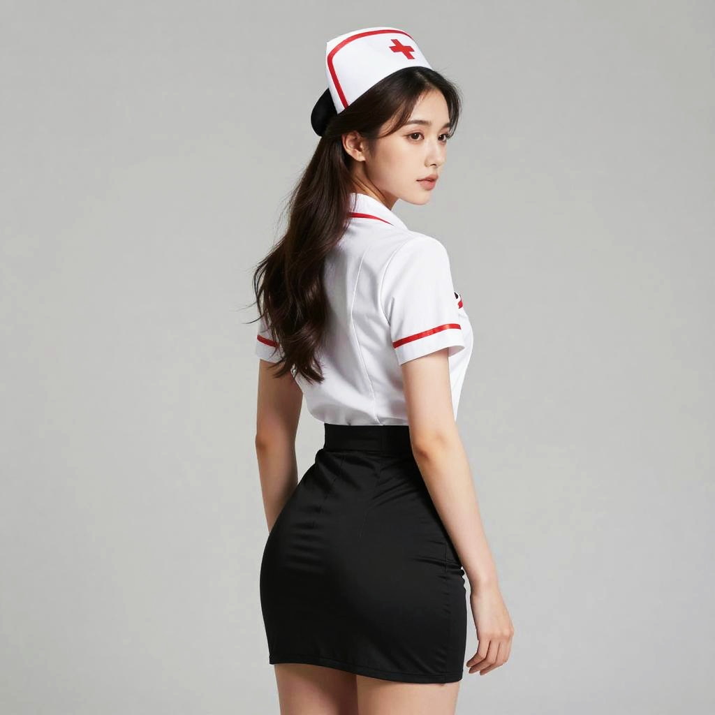 Portrait of a young woman wearing a nurse costume consisting of a white top with red trim, a matching nurse cap with a red cross, and a tight black skirt. The photo features soft lighting and a neutral gray background, highlighting the subject's long dark hair and poised expression.