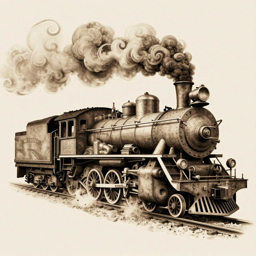 Side profile tattoo featuring a vintage-style steam locomotive, steam and smoke blending into curls and waves, sepia tones, nostalgic and intricate mechanical details