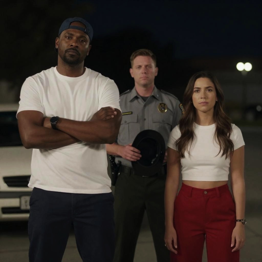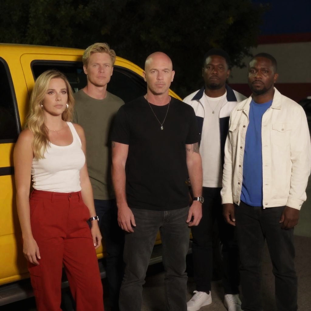 Photograph of five people standing in front of a yellow pickup truck at night. Five individuals: blonde woman in white tank top and red pants, blonde man in green shirt, bald man in black shirt and necklace, dark-skinned man in white and blue jacket, dark-skinned man in white jacket and blue shirt. Truck bed visible, trees in background. People standing in a line, serious expressions. Casual, urban setting.
