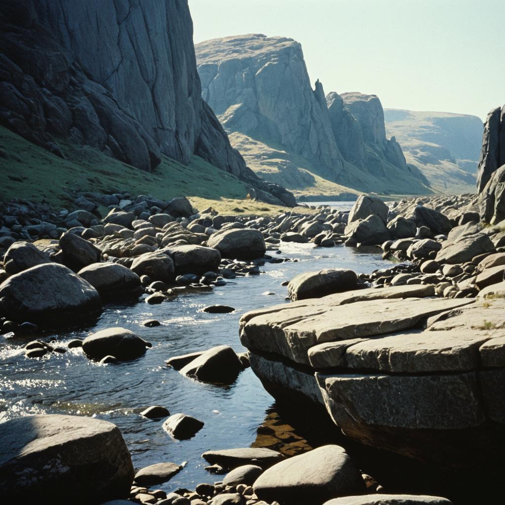 A serene landscape featuring a sun-drenched rocky river cleft with smooth flat stones and large boulders scattered along the river shore. The scene includes tall cliffs and sparse grassy clearings, creating a peaceful and placid natural environment under a clear sky.