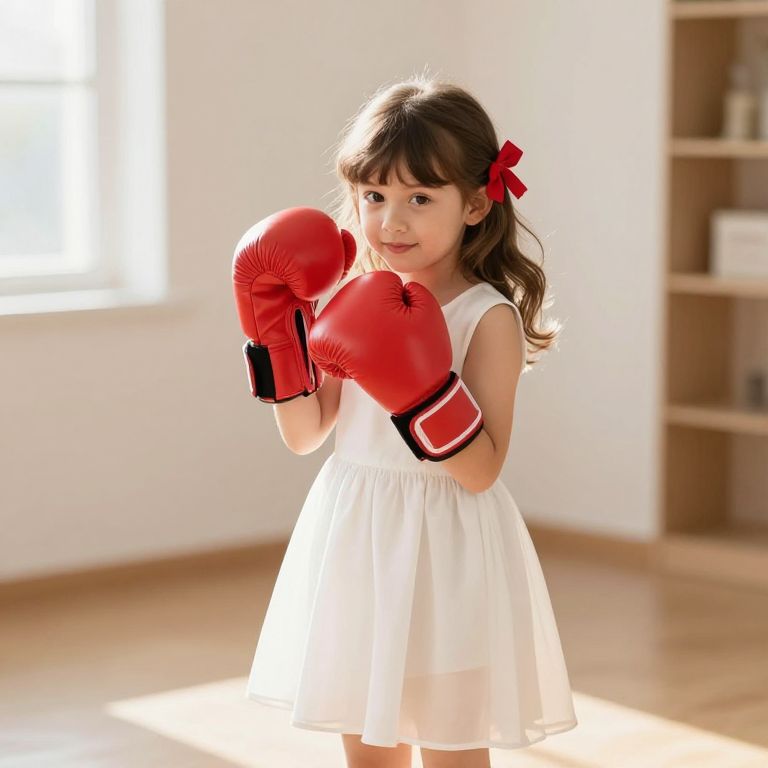 A confident young girl with freckles and a sun-kissed complexion dressed in a bold retro tennis costume — complete with a red and black sash, white tennis socks, and a cap with a racquet emblem — playing a point on a grass court under a clear blue sky with golden sunlight filtering through.