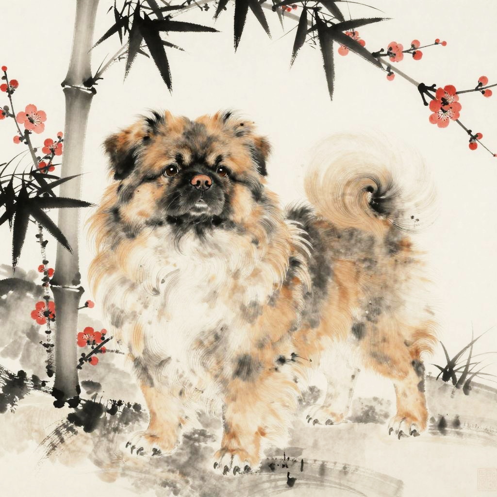 Ancient Pekingese dog depicted in a classic Chinese ink painting style, surrounded by bamboo stalks and plum blossoms, the dog portrayed with a dignified pose and flowing fur, subtle monochrome shades with delicate red accents on the blossoms, evoking a serene and timeless atmosphere.