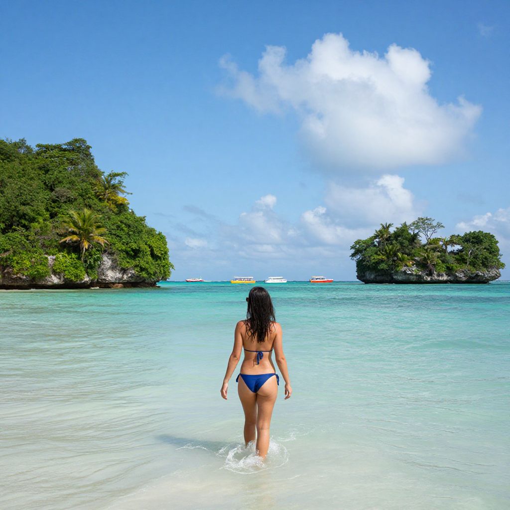 Woman enjoying a sunny day in Cancun, Mexico, as she walks through crystal-clear turquoise waters with lush green islands and vibrant boats visible in the distance under a bright blue sky dotted with fluffy white clouds.