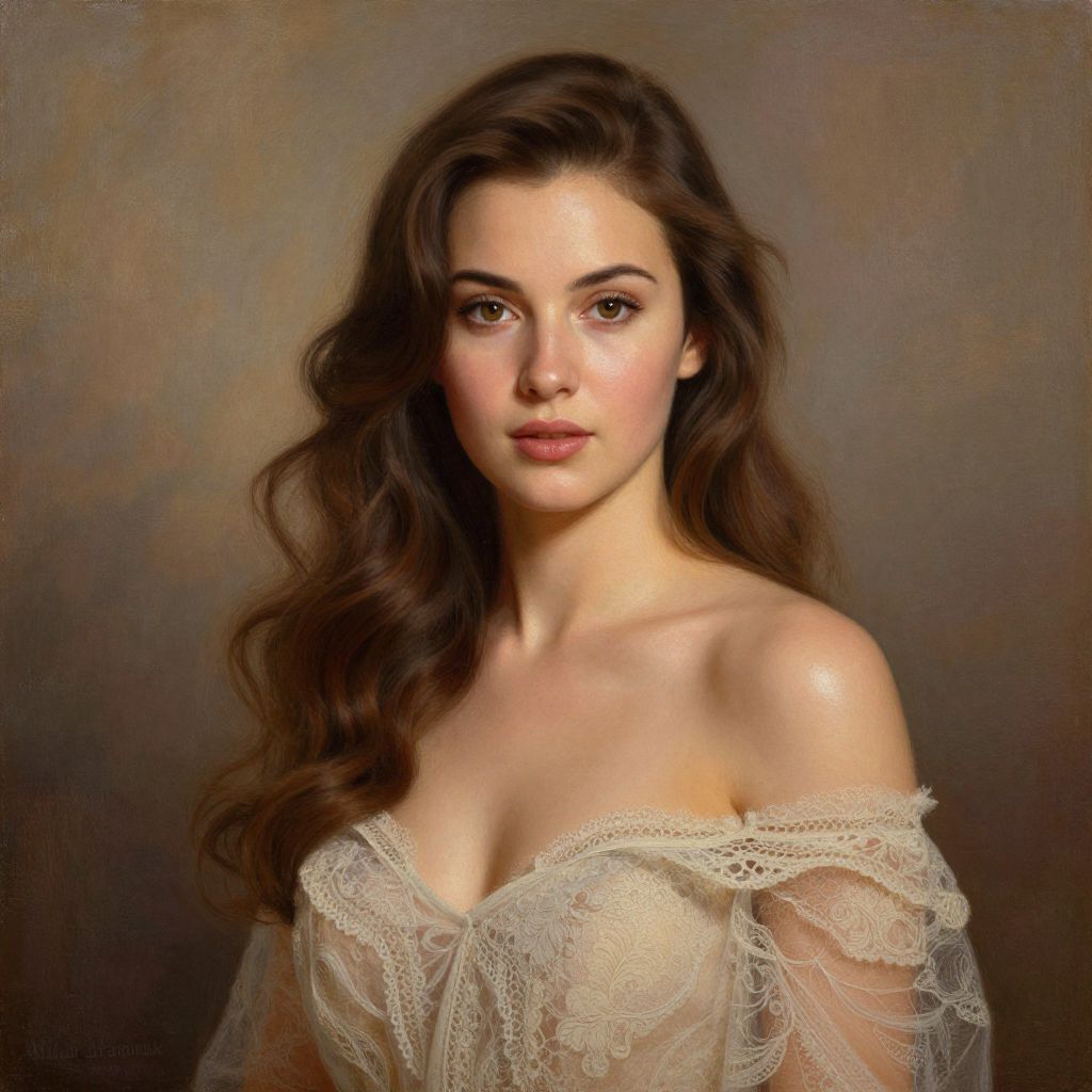 Photorealistic digital painting of a young woman with fair skin and long, wavy brown hair. She has large, expressive brown eyes, a small nose, and full lips. She wears an off-the-shoulder, sheer lace top with intricate floral patterns, revealing a hint of cleavage. The background is a muted, textured gradient of brown and gray, which contrasts with her delicate, light-colored attire. The lighting highlights her smooth skin and the texture of the lace, creating a soft, ethereal effect. The artist's signature, "V. V," is in the bottom left corner.