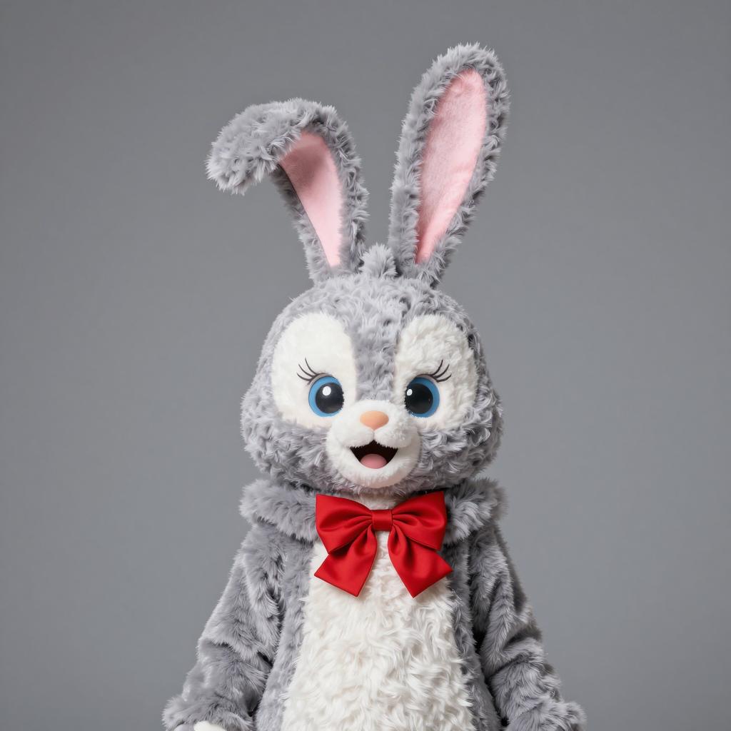 Person wearing a full-body bunny mascot costume featuring gray and white fur, tall ears with pink inner lining, a red bow tie, and a gray coat with fur trim. The character has large cartoon-style eyes and a cheerful expression. The background is plain gray with vignette lighting.