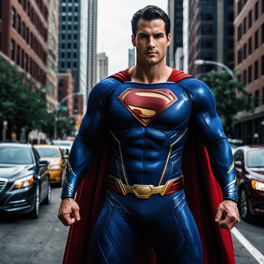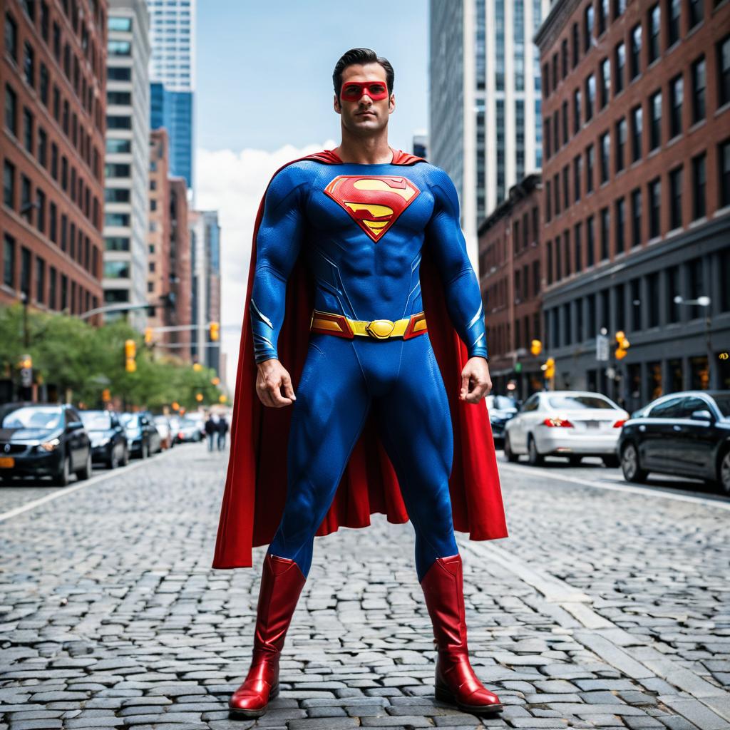 Superhero cape costume, photorealistic, digital art, Superman standing in city street, daytime, full body, muscular male, blue skin-tight suit with yellow belt, red cape, red boots, red "S" emblem on chest, blue mask with red accents, urban background, people in distance, tall buildings, cobblestone street, clear sky, slightly blurred background, superhero, realistic ures, bright colors, symmetrical composition, confident pose, high contrast, modern city atmosphere, photorealistic style, T2I model