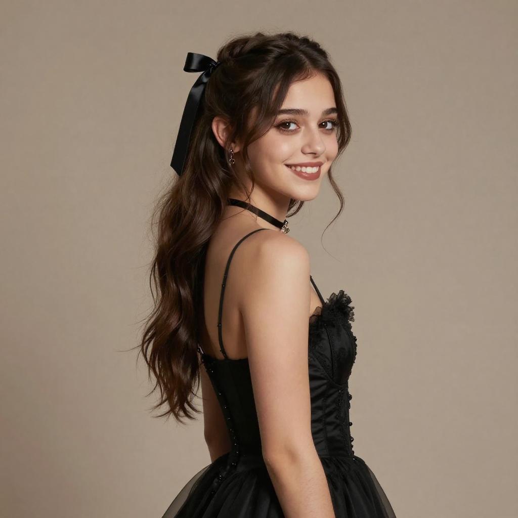 Hyperrealistic (1girl) portrait of (Jenna Ortega:1.2) with a (hair ribbon) and (side ponytail) wearing a (black gothic dress), (smile), on a (simple background), photo realistic, artstation, 4k, award winning, art by greg rutkowski