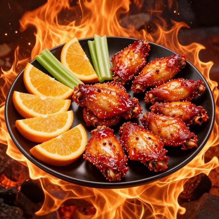 Photograph of a black plate filled with six glossy, deep-fried chicken wings coated in a rich, sticky red glaze, sprinkled with sesame seeds. The plate also contains four bright orange slices and four green celery stalks. The plate is set against a dramatic background of vivid orange and yellow flames, enhancing the dish's appetizing appearance. The flames create a sense of heat and excitement, contrasting with the dark plate and making the food appear even more enticing. The overall composition is vibrant and visually striking.