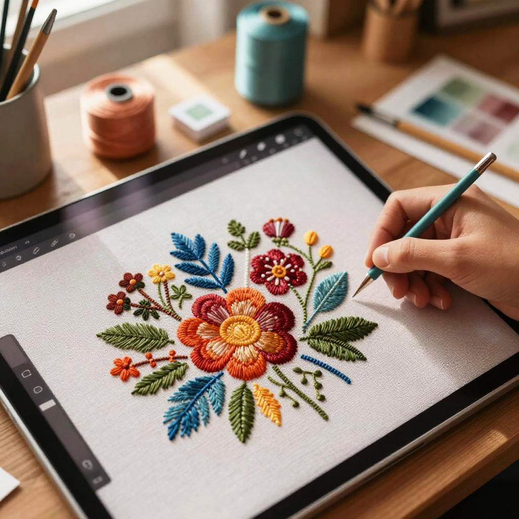 Create your own embroidery designs online free, close-up of a digital embroidery editor showing intricate floral patterns, bright needlework icons, virtual threads swirling in air, cozy creative studio background with art supplies, warm sunlight ambiance