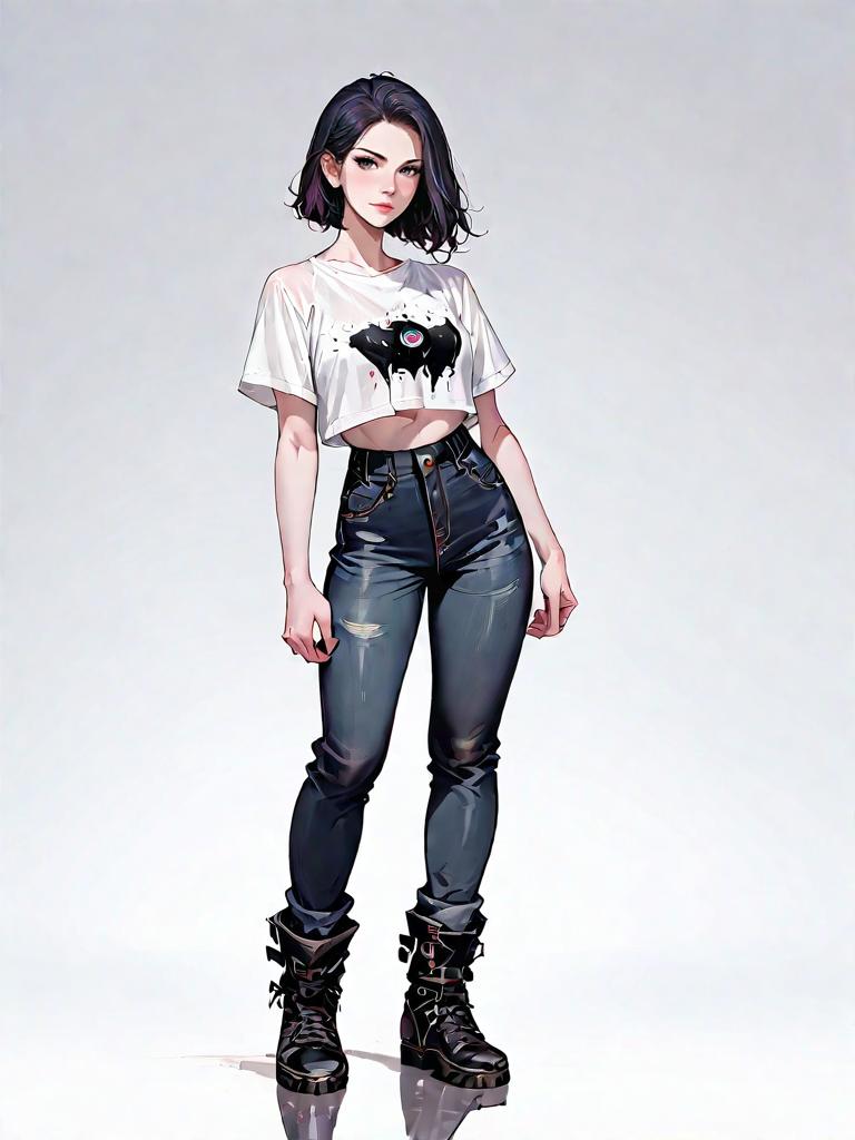 1girl, realistic face, full body shot, Woman, casual street style, cropped mesh t-shirt in a pink tie-dye pattern, short sleeves, crew neck, high-waisted ecru utility pants with pockets, visible button closure, white background.