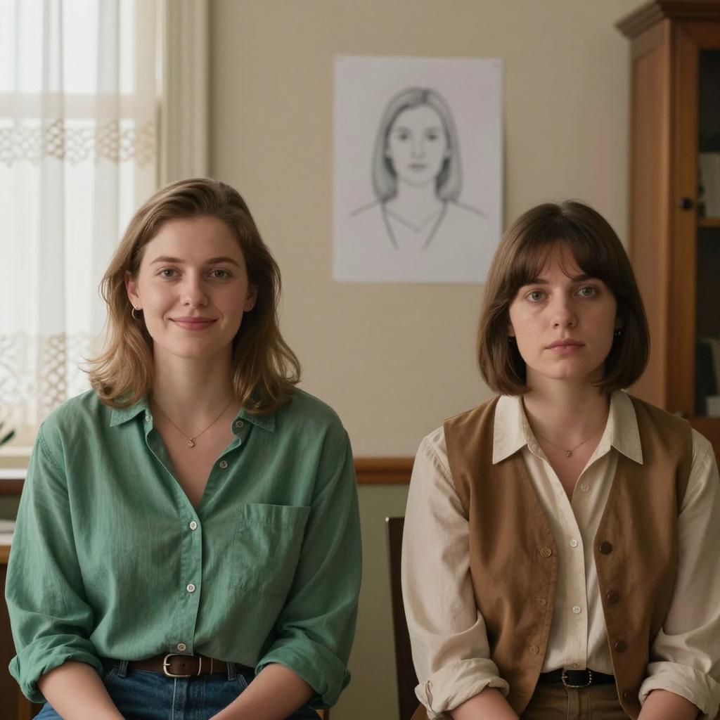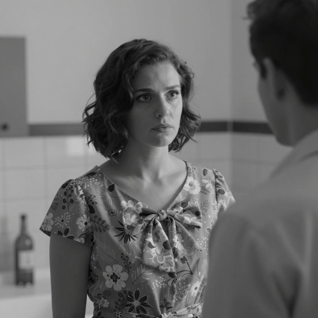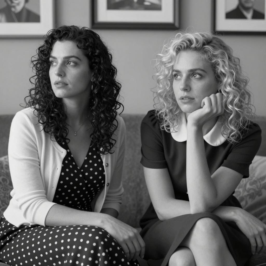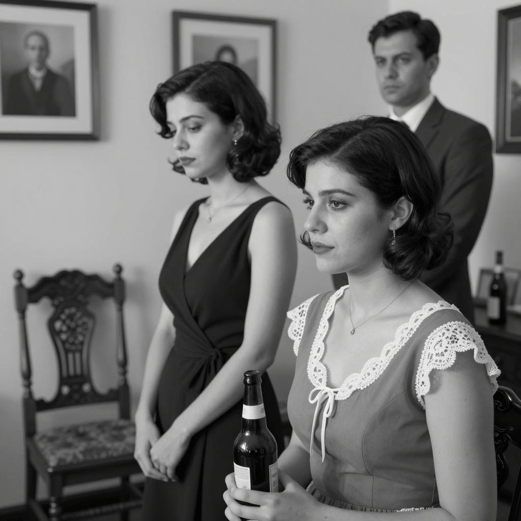 Black and white photo featuring three individuals in a vintage-style room. Foreground shows a young woman with short dark hair wearing a lace-trimmed dress holding a bottle. Another woman with dark, wavy hair in a sleeveless black dress stands nearby looking downward. A man in a suit with a serious expression stands in the background. The room contains antique wooden chairs and framed portraits on the wall.