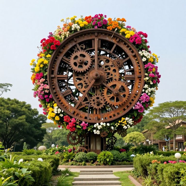Photograph of a large, rusted metal gear sculpture adorned with vibrant, multicolored flowers (red, yellow, pink, white) encircling the top and filling the gaps between the gears. The sculpture stands in a lush, manicured garden with a stone pathway leading to its base. Green shrubs and trees surround the garden, and a wooden building is partially visible on the right. The sky is clear and blue, enhancing the bright colors of the flowers and the greenery. The overall scene is vibrant and visually striking, blending industrial and natural elements harmoniously.
