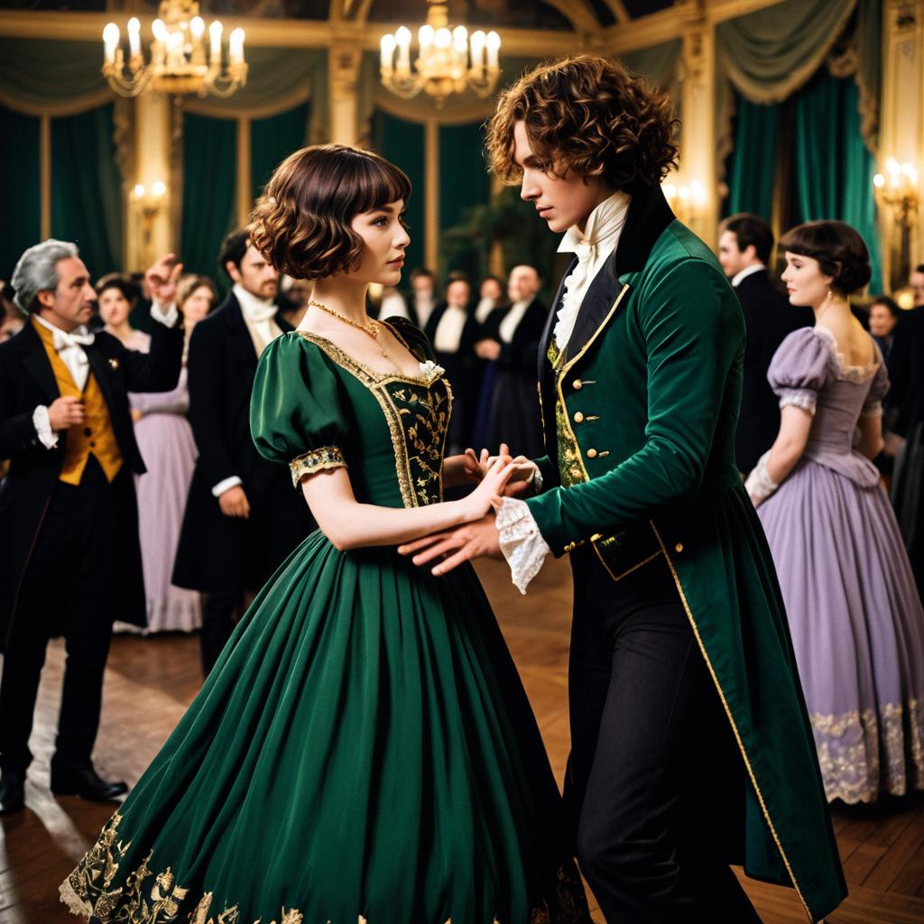 Couple dancing, he is wearing a forest green frock coat with gold embroidery and has short curly chestnut hair, she is wearing a lilac chiffon gown with lace trim and she has brunette bob haircut and amber eyes, cinematic scene, other couples dancing in the background, aristocracy, 1800, vampires, manga, anime style