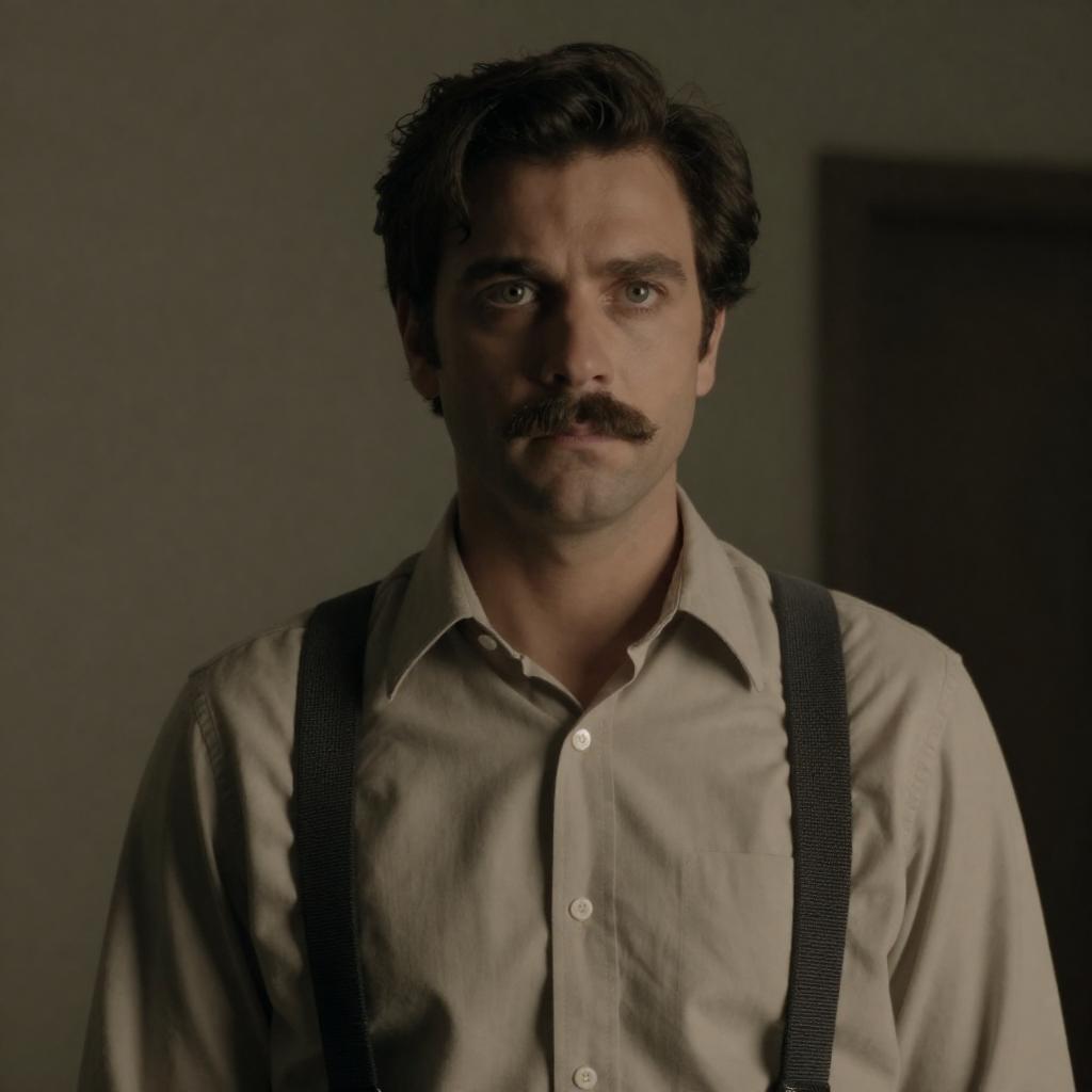 Medium-shot photo of a serious-looking man with dark brown hair, green eyes, and a prominent mustache. He is wearing a beige button-up shirt with black suspenders. The background is dimly lit and shadowy, adding to the intense and focused expression on the man's face.