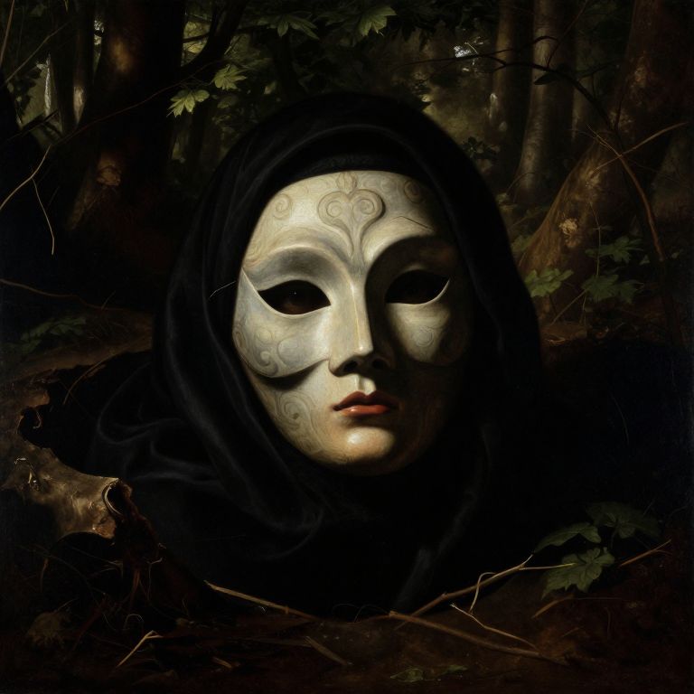 A digital photograph depicts a white, ornately decorated mask with black eye holes and intricate floral patterns, set against a dark, dense forest background. The mask is centered and surrounded by shadows, with only the mask's face and a hint of a black hood visible. The forest features dark, textured tree trunks and sparse green leaves. The mask's expression is neutral, with slightly parted red lips. The lighting highlights the mask, creating a contrast against the dark, mysterious forest background.