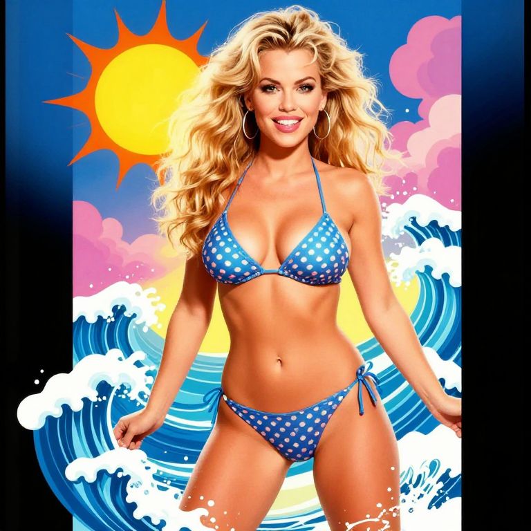 Pamela Anderson bikini vintage poster style, bold colors, graphic elements, pop art influence, energetic atmosphere, beach volleyball background