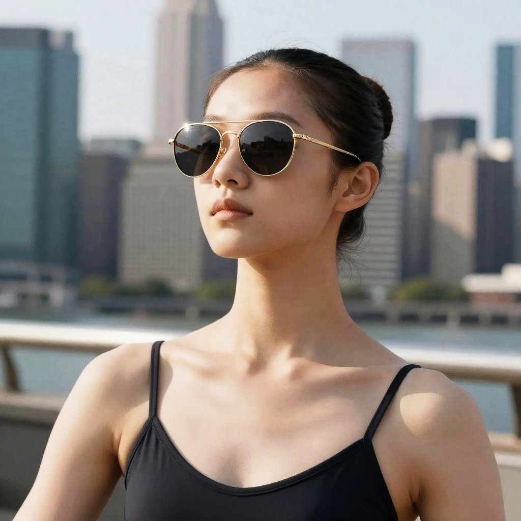 Ballet dancer in gold-rimmed oversized sunglasses, looking out over a bustling city skyline