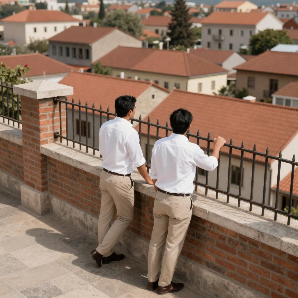 Photograph of two men walking side by side on a sunlit path in a park. Both wear dark jackets and blue jeans. The man on the left has short dark hair, while the man on the right has a bald head. Tall trees and green shrubs surround them, with a stone wall in the background.