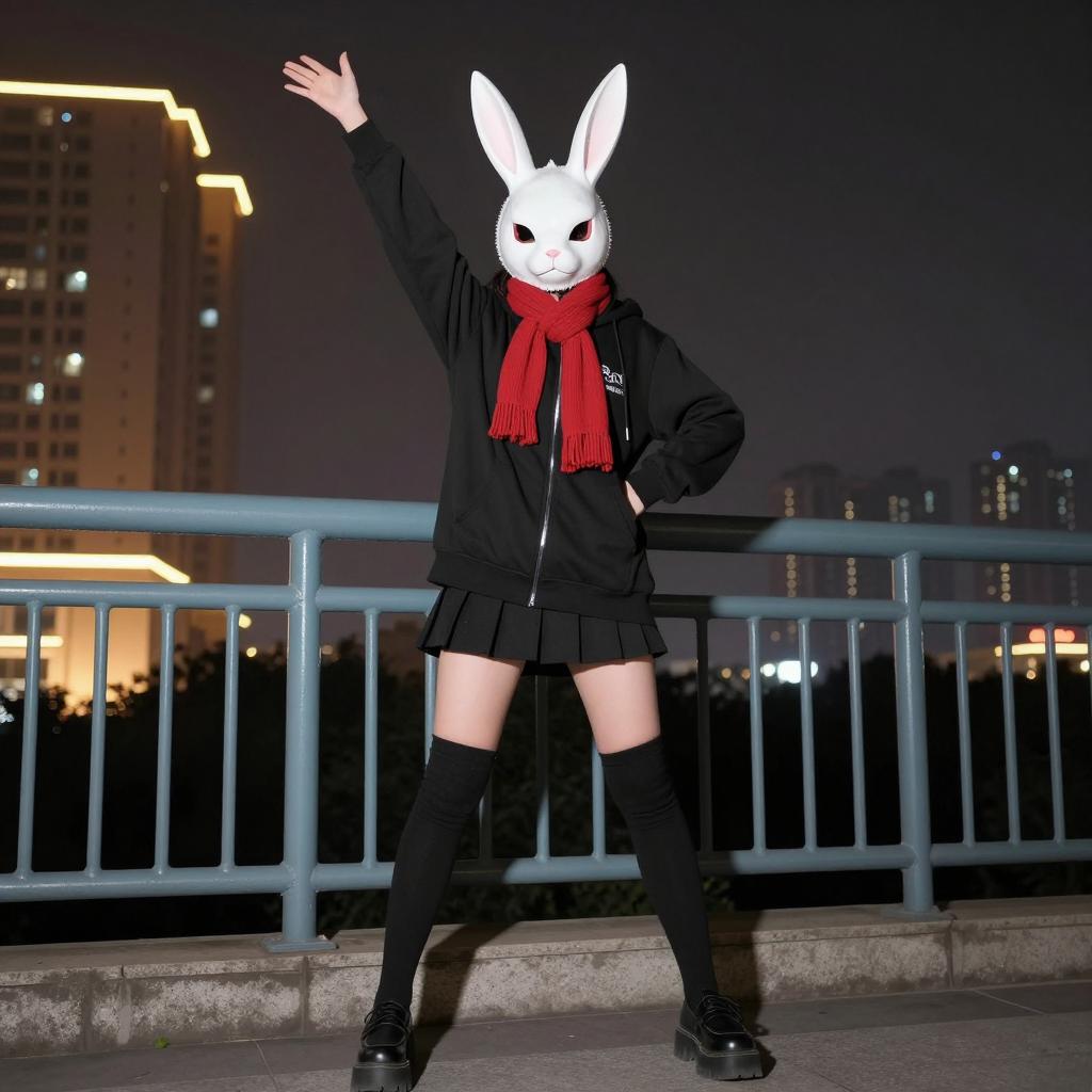 Asian woman with long black hair, wearing a white shirt with a red bow tie and black cardigan, holds a white bunny mask with black eyes and ears, obscuring her face. Red lighting illuminates the background with wrinkled curtains. She stands in a room with white walls and a door.