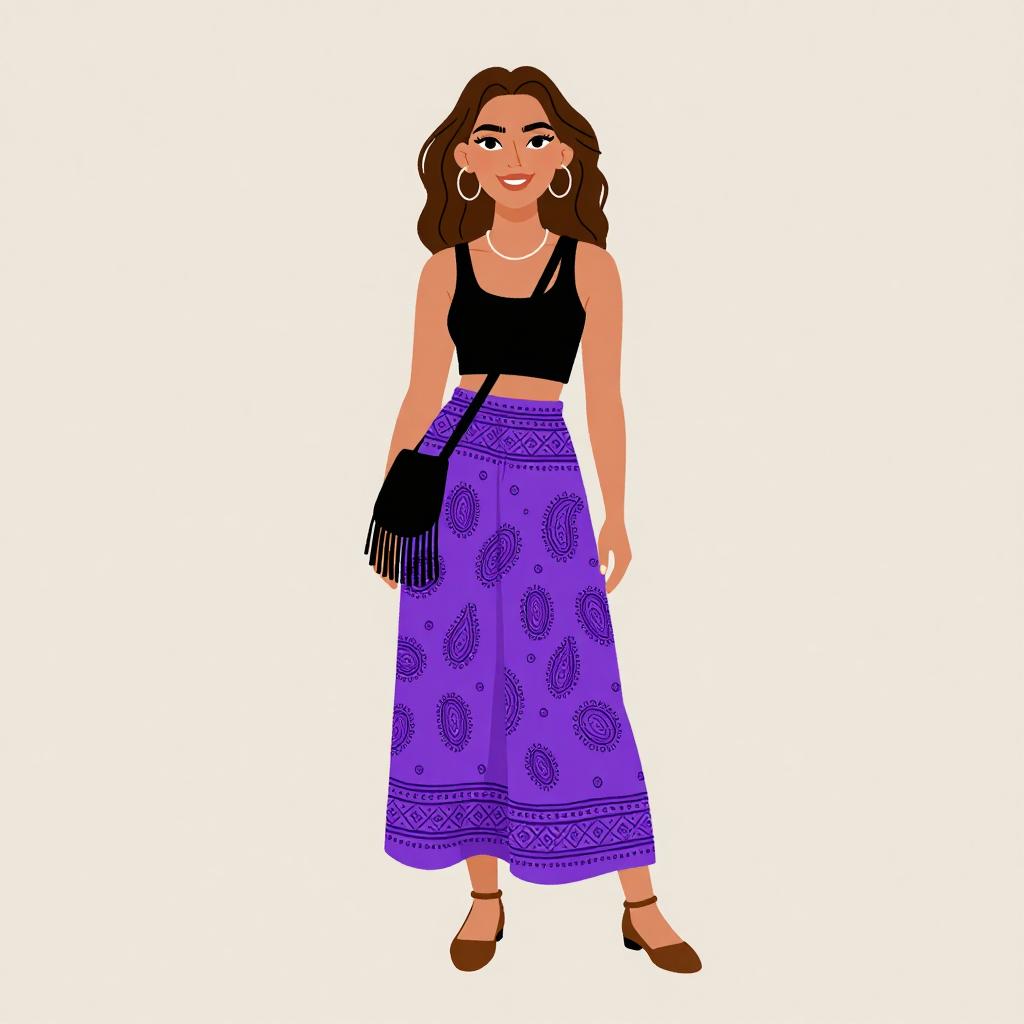 Digital illustration of a smiling, light-skinned woman with dark brown hair, wearing large hoop earrings. She dons a white, sleeveless crochet top and high-waisted, wide-legged pants in vibrant pink and purple with geometric patterns. Her feet are in brown sandals. The background is plain white, emphasizing the colorful outfit. The style is cartoonish with bold colors and simplified features. The woman stands confidently, arms relaxed by her sides.