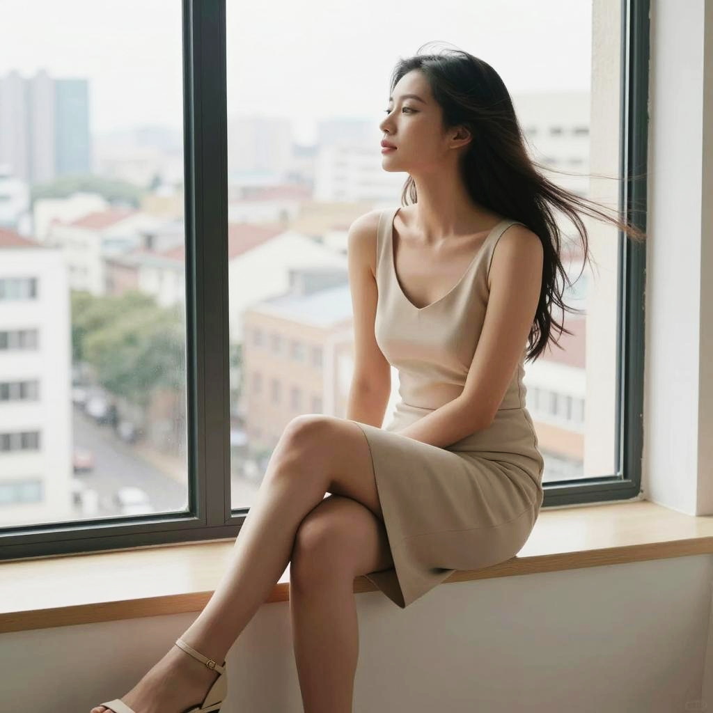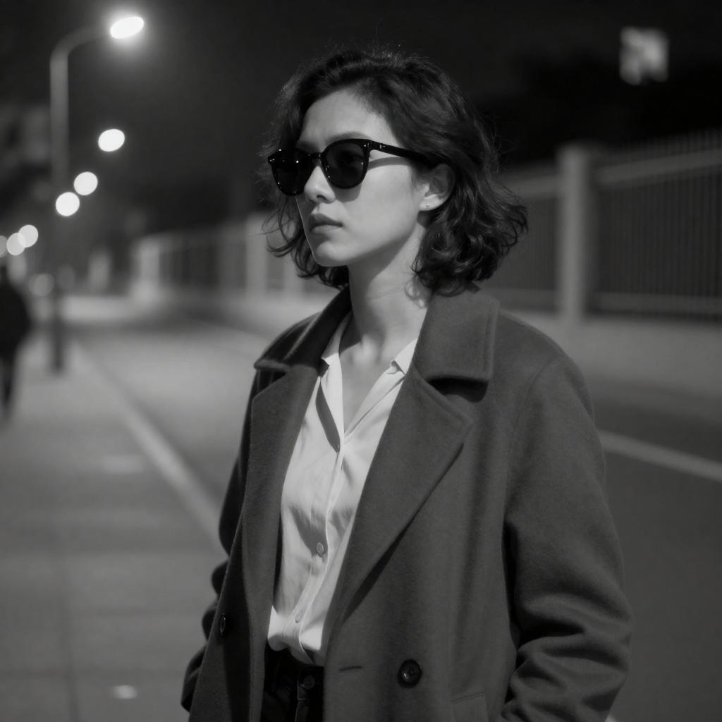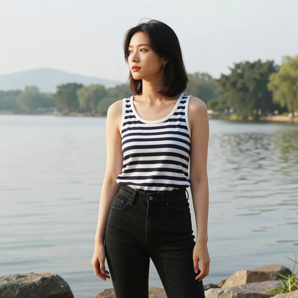 Photograph of a woman with medium-length dark hair, wearing sunglasses and a light pink tank top, leaning against a metal guardrail. Her right arm rests on the guardrail, and her left hand is relaxed. Clear blue sky in the background. Her expression is neutral. Bright sunlight casts shadows. Rural setting with some greenery below the guardrail.
