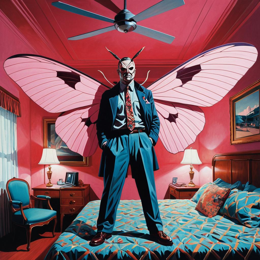 Realistic detailed image of a large moth man in a pink bedrooml in the style of francis bacon, surreal, norman rockwell and james jean, greg hildebrandt, and mark brooks, triadic color scheme, by greg rutkowski, in the style of francis bacon and syd mead and edward hopper and norman rockwell and beksinski, open ceiling, highly detailed, painted by francis bacon, painted by james gilleard, surrealism, airbrush, ilya kuvshinov, wlop, stanley artgerm, very coherent, art by takato yamamoto and james jean