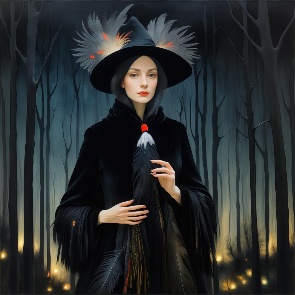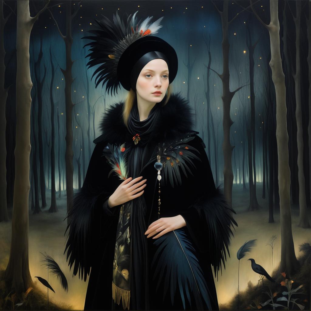 A tall, slim woman dressed in elegant black clothing with feather accents, wearing a matching hat and scarf. She stands in a mysterious nighttime forest illuminated by soft glowing lights. The image evokes a surreal, painterly style inspired by Hieronymus Bosch, featuring dark tones and intricate feather details.