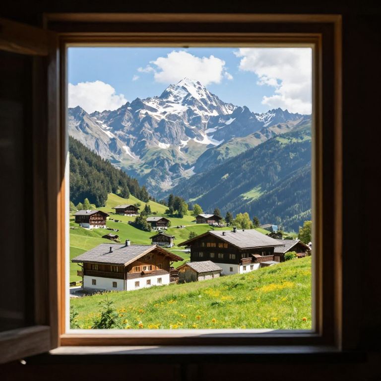 Scenic view of traditional wooden alpine houses and green meadows in Ahrntal, North Italy, framed by a window. Snow-capped mountains and blue sky with clouds form the picturesque background.