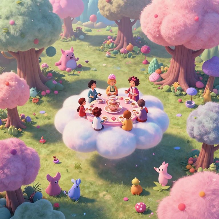 Whimsical digital art of colorful children having a tea party on a cloud in a vibrant, fairy-tale forest with fluffy pink trees and adorable creatures