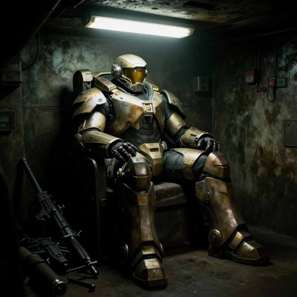 Fallout show power armor resting in an underground bunker, illuminated by flickering fluorescent lights, worn metal plates and heavy hydraulic limbs, surrounded by scattered weapons and tools, immersive and detailed scene