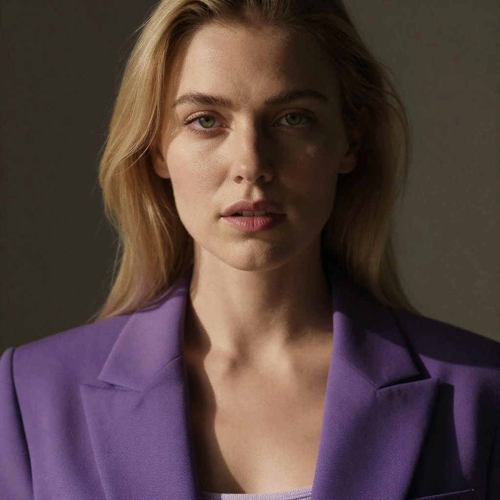Photograph of a blonde woman with fair skin and intense gaze, wearing a red parka with a fur hood. She is slightly turned to the right, looking over her shoulder. Background includes blurred office furniture and drawers. Blue lighting.