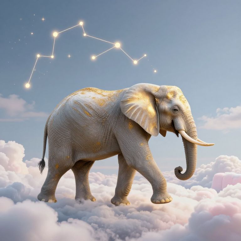 An ethereal elephant adorned with celestial gold traverses a dreamlike sky of marshmallow clouds, unknowingly weaving constellations in its wake, embodying the quiet wonder of cosmic creation and the timeless dance between purpose and serendipity.