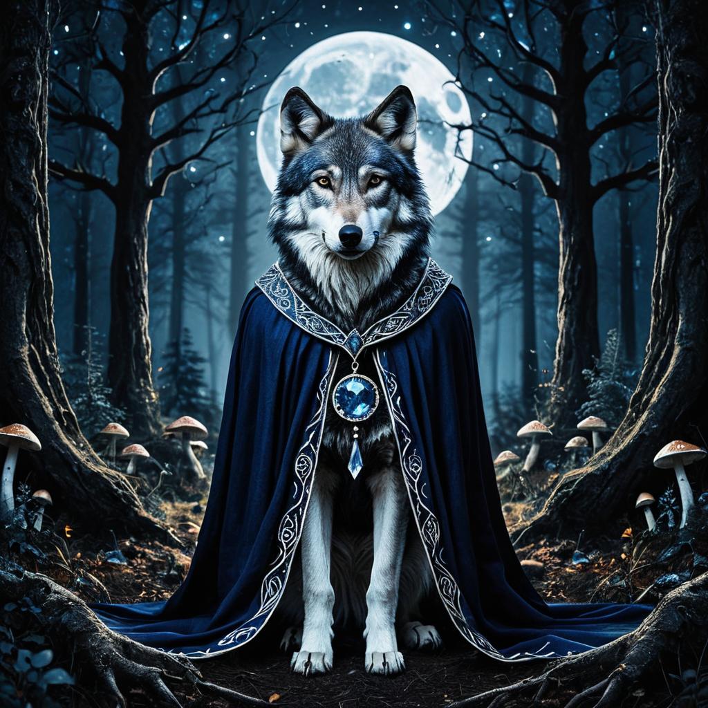 Striking, elegant portrait of a enchanted wolf with a mystical touch. Wearing flowing midnight-blue cape with silver runes, crystal pendant, set against a moonlit ancient forest with glowing mushrooms.
