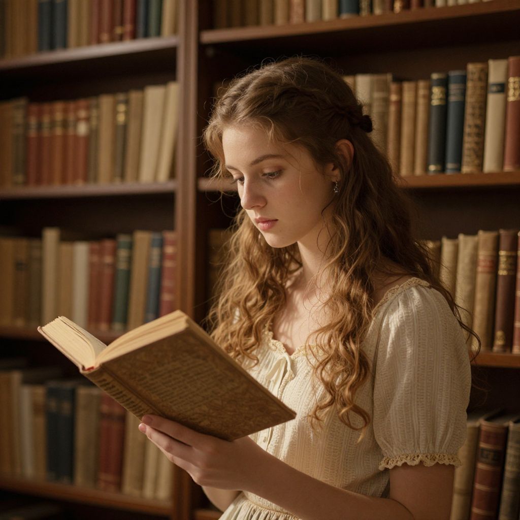 In a serene library bathed in golden hour light, a young woman engrossed in reading an ancient tome exudes a vintage charm, her long hair cascading like a flowing narrative against the backdrop of neatly arranged bookshelves, evoking the timeless allure of classic literature and the whispered secrets of its pages.