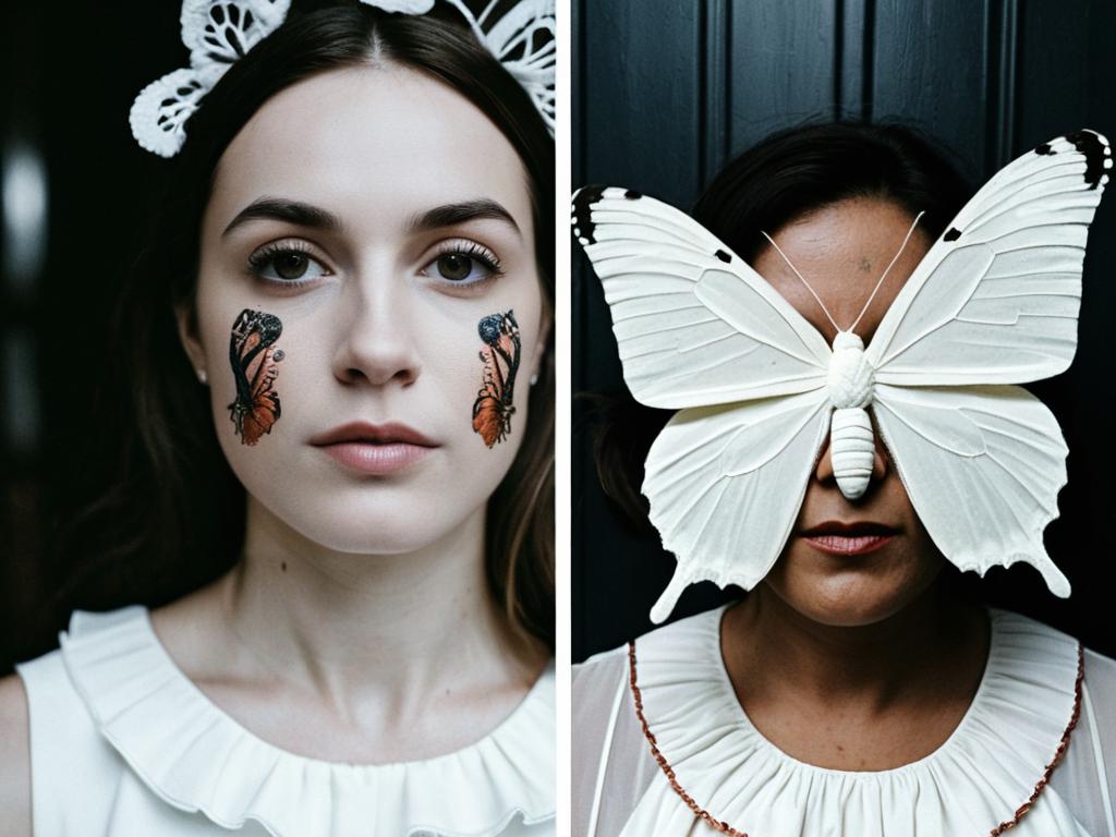 Moth Fancy Dress face swap, a close up of a woman wearing a white dress with a butterfly on it