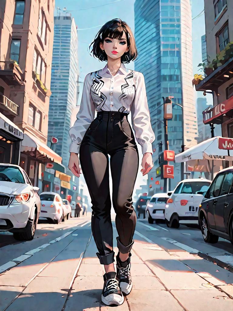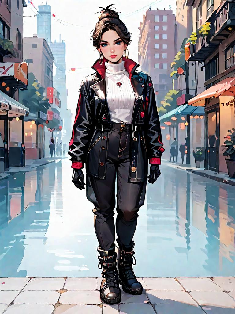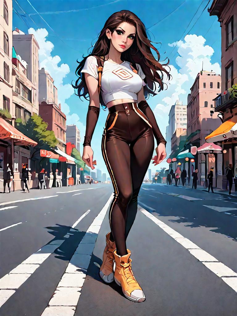 1girl, source_comics, realistic face, full body shot, Woman, athletic wear, color-blocked sports bra in red and black with a scoop neckline, high-waisted leggings in black with red and gray geometric panels, cropped at mid-calf, black running shoes with white soles, white studio background.