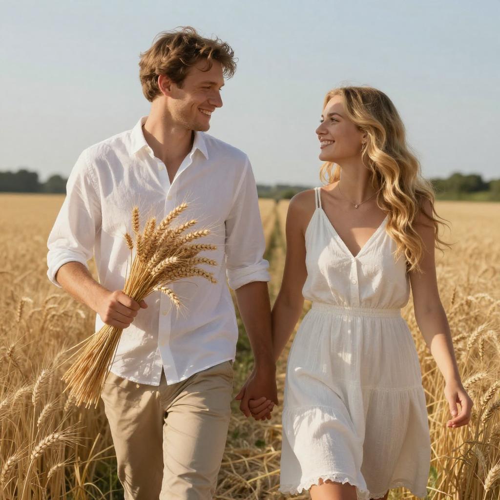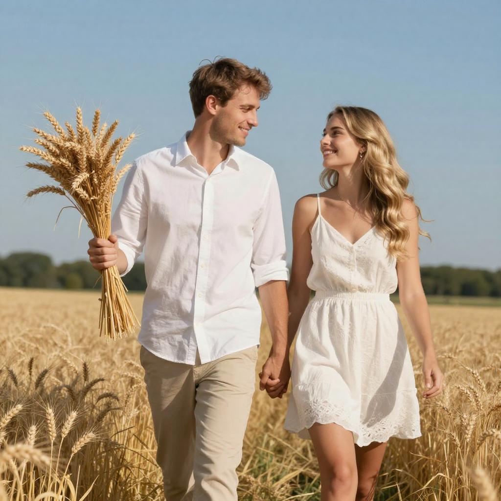 Photograph of a cute couple walking through a golden wheat field on a sunny day. The man, with short brown hair and a white button-up shirt, holds a bundle of dried wheat in his left hand. The woman, with long wavy blonde hair, wears a sleeveless white dress and holds his right hand. They're both smiling and looking at each other. The background shows a clear blue sky and a green treeline.