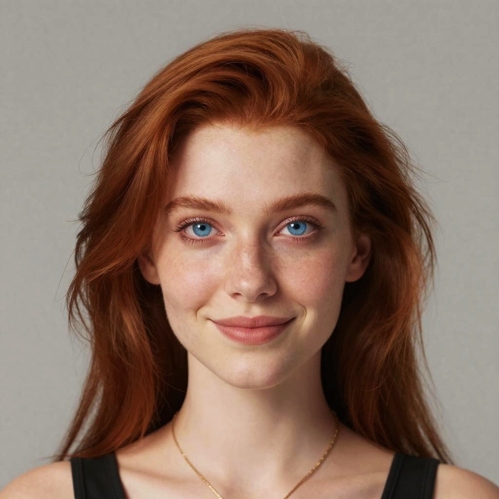 This is a digital portrait of a fair-skinned woman with striking blue eyes and red, slightly messy hair. She has a subtle smile and wears a gold necklace. Her makeup is minimal, highlighting her natural beauty. The background is a simple gray, keeping focus on her face. The image has a realistic yet slightly stylized, CGI-like quality.