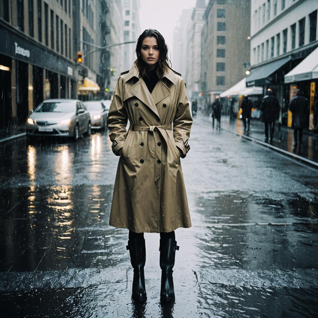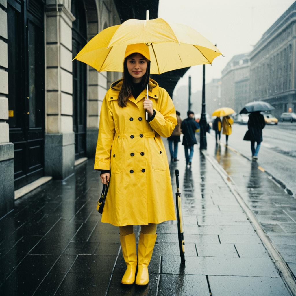 Yellow Costume Woman, woman in yellow raincoat and hat standing on sidewalk with umbrella