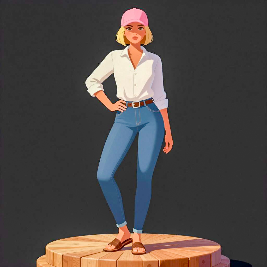 Digital illustration of a blonde woman with short hair, wearing a pink baseball cap, white button-up shirt, blue tight jeans, and brown belt, standing on a round wooden platform. She has her right hand on her hip, left arm slightly bent, and wears brown sandals. Dark background. Her expression is neutral. She is standing with legs crossed slightly at the ankles.