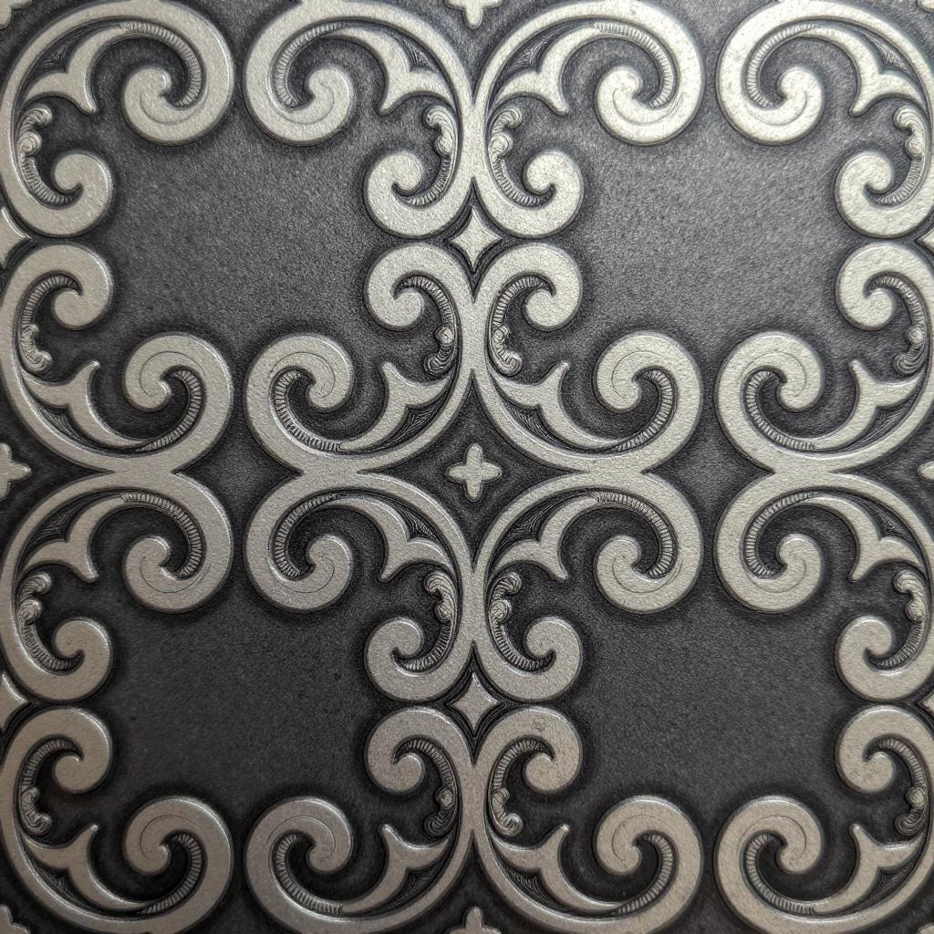 Scrollworks pattern featuring tattoo-style scrollwork with bold outlines and negative space in silver-white scrollwork on dark charcoal background arranged as seamless repeating wallpaper pattern with interlocking flourishes on polished engraved metal plate rendered as ink drawing with fine linework and stippling, ultra-detailed, sharp ornamental design, high resolution, intricate decorative pattern art