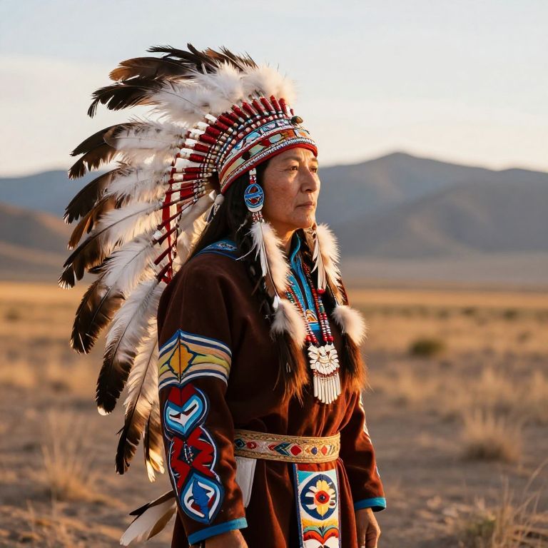 Shoshone tribe in traditional clothing, vibrant native patterns, desert landscape with mountains in the background, golden hour lighting, detailed feathers and beadwork, historical and cultural richness, artistic realism style