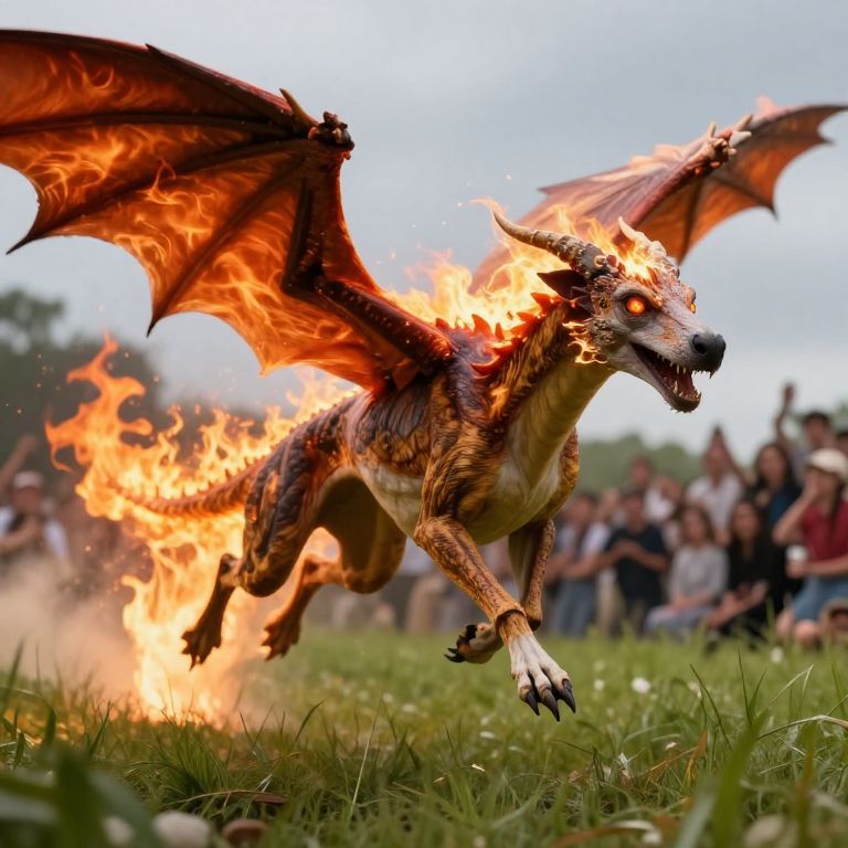 Photograph of a fiery, dragon-like creature with glowing orange eyes and burning wings mid-leap, surrounded by a blurred crowd in a grassy field