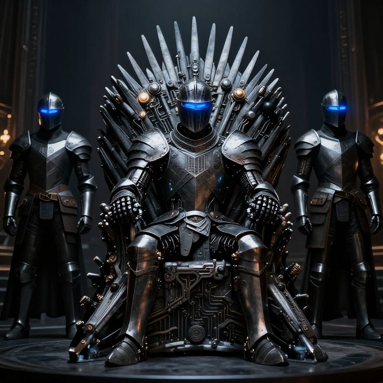 Game of Thrones AI characters visualized as robotic knights with glowing blue visors, standing guard at the Iron Throne made of circuitry and steel, a dark fantasy world mixed with futuristic AI technology, highly detailed and cinematic composition.